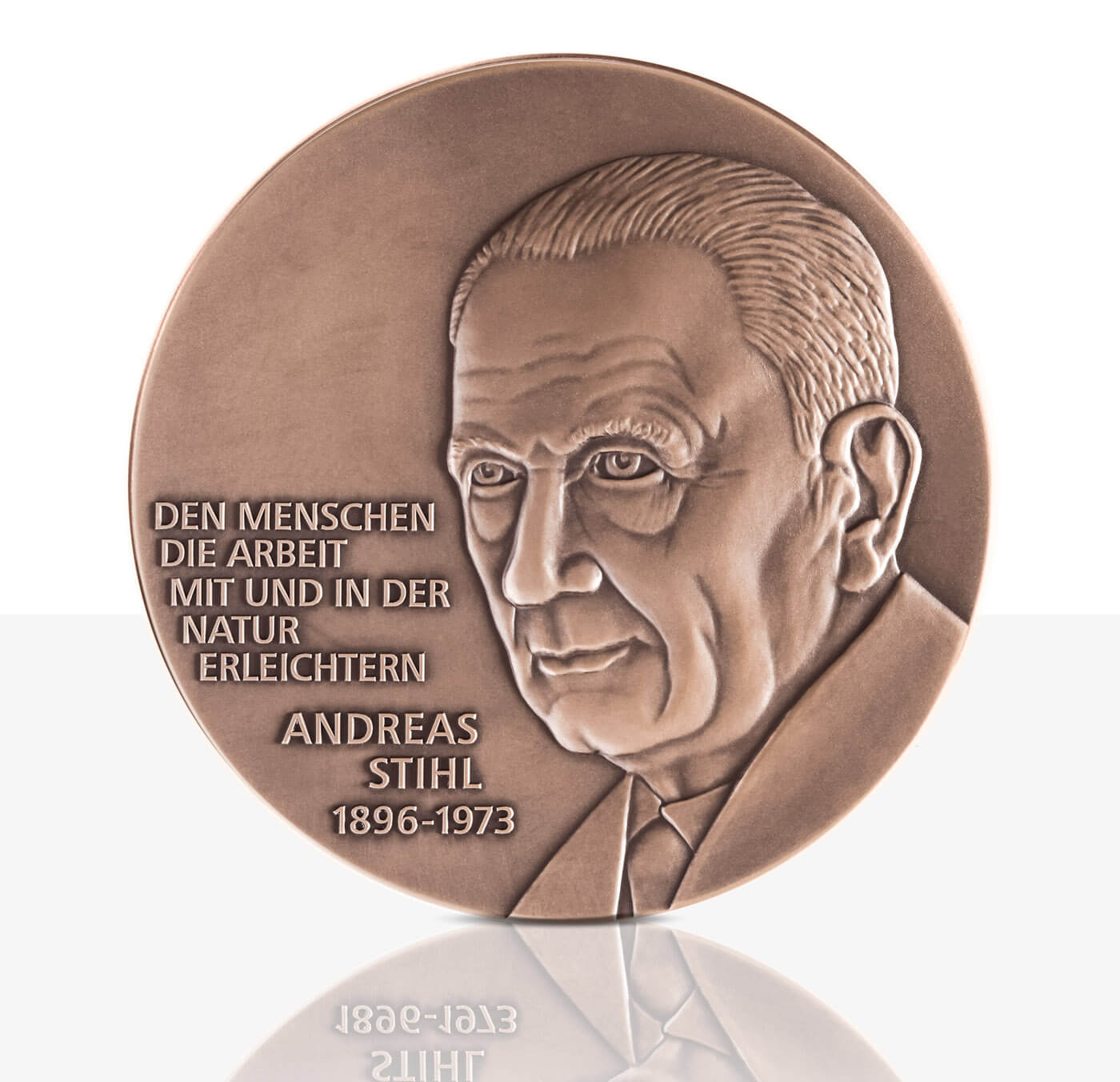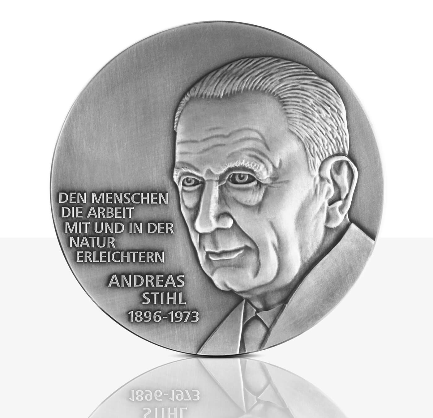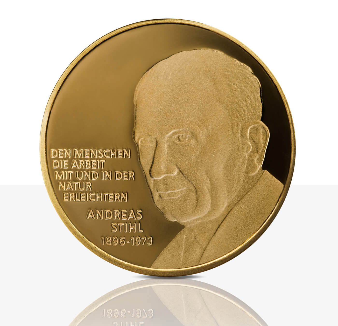 Die Medaille von 2016 aus der Serie „Erfinder aus Baden-Württemberg“ erinnert an das bleibende Schaffen des Pioniers Andreas Stihl.