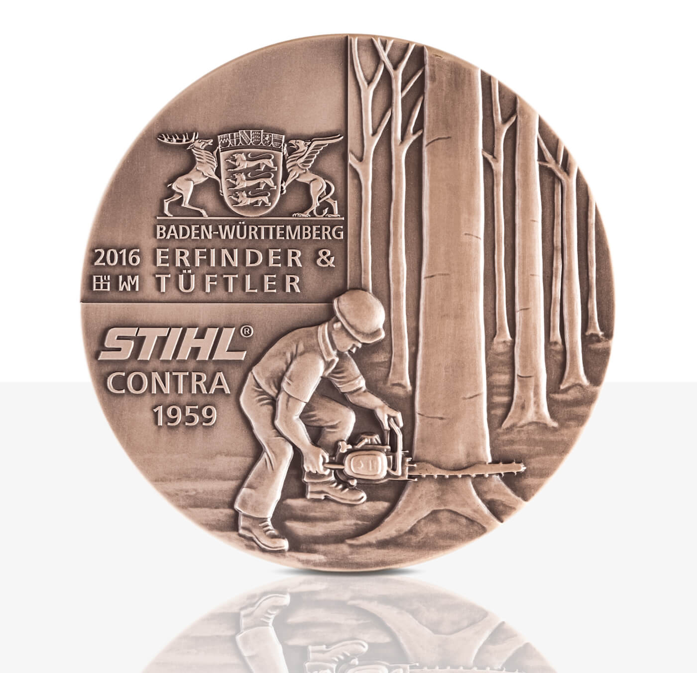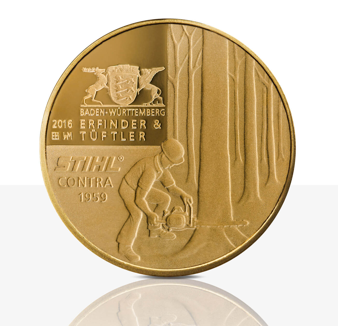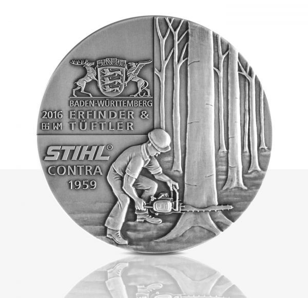 Die Medaille von 2016 aus der Serie „Erfinder aus Baden-Württemberg“ erinnert an das bleibende Schaffen des Pioniers Andreas Stihl.